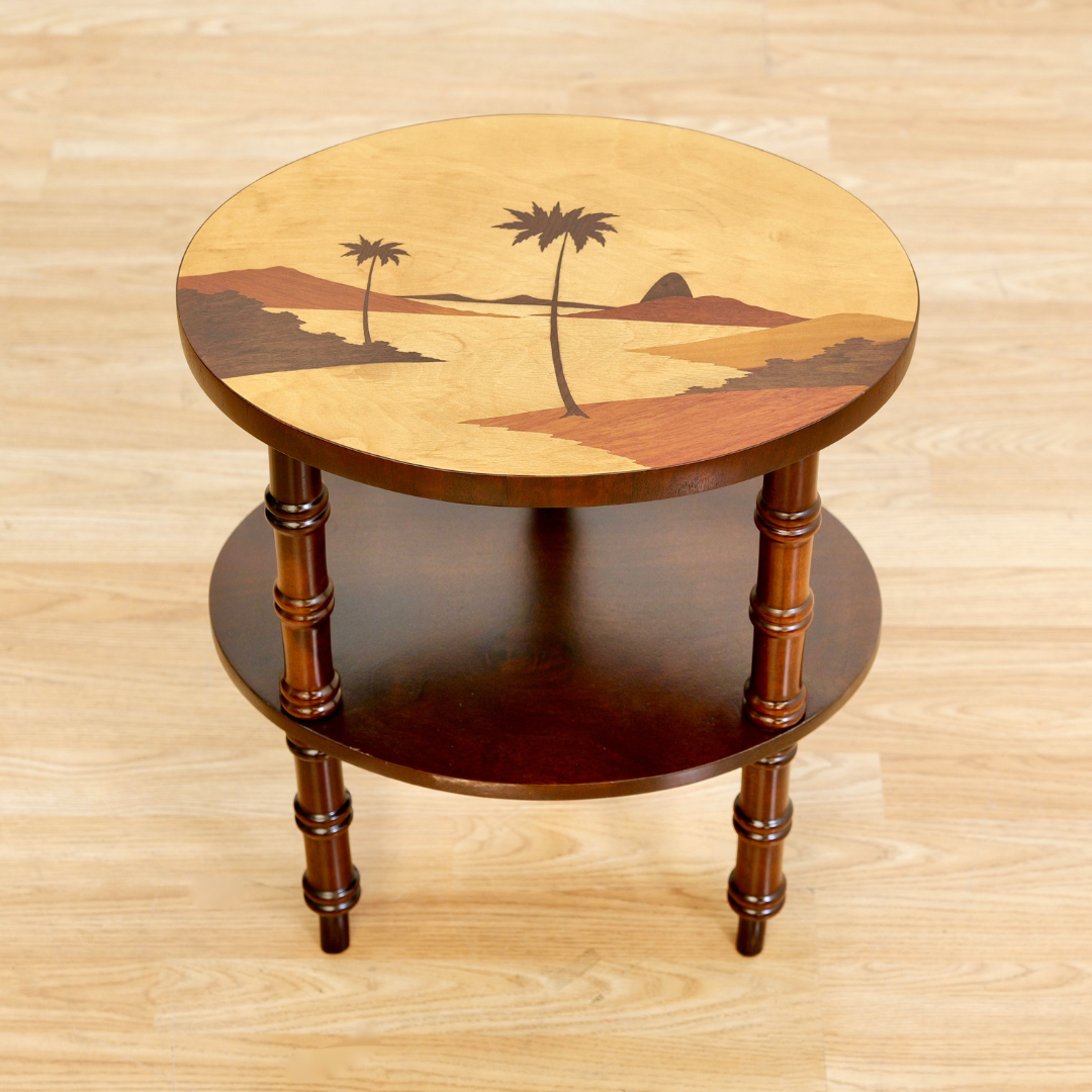 1950s Brazilian Tiki Side Table Inlaid Marquetry Beach Scene