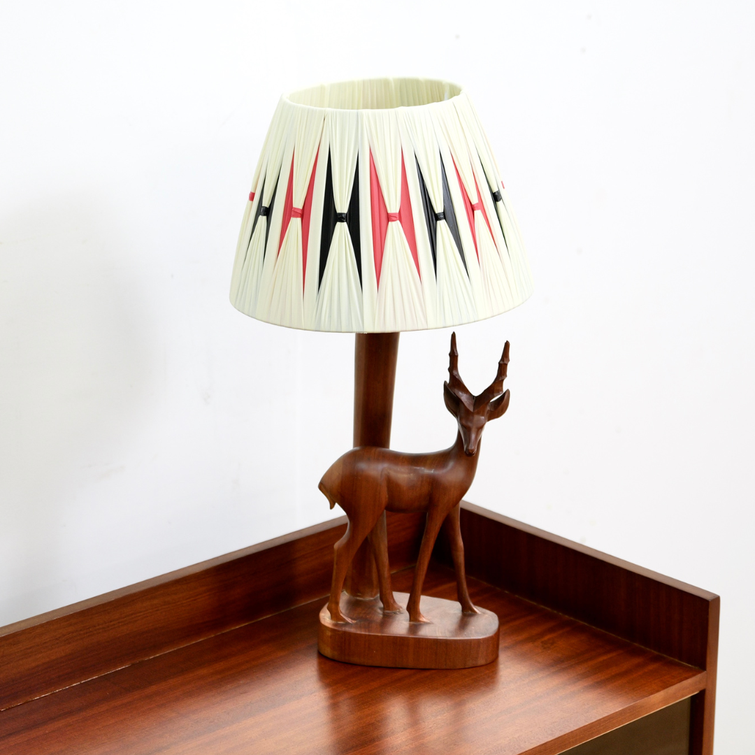 Fantastic hand carved African mid-century table lamp featuring a stag or antelope. The kitsch shade is also handmade and while not original compliments this composition perfectly.
