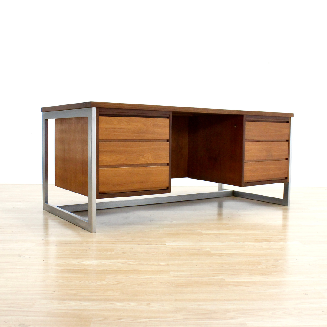 This Mid Century executive desk was produced by Gordon Russell in England during the 1960s. A large, handsome desk with quality construction from teak and chrome it is a stunning example that would make a perfect work station.