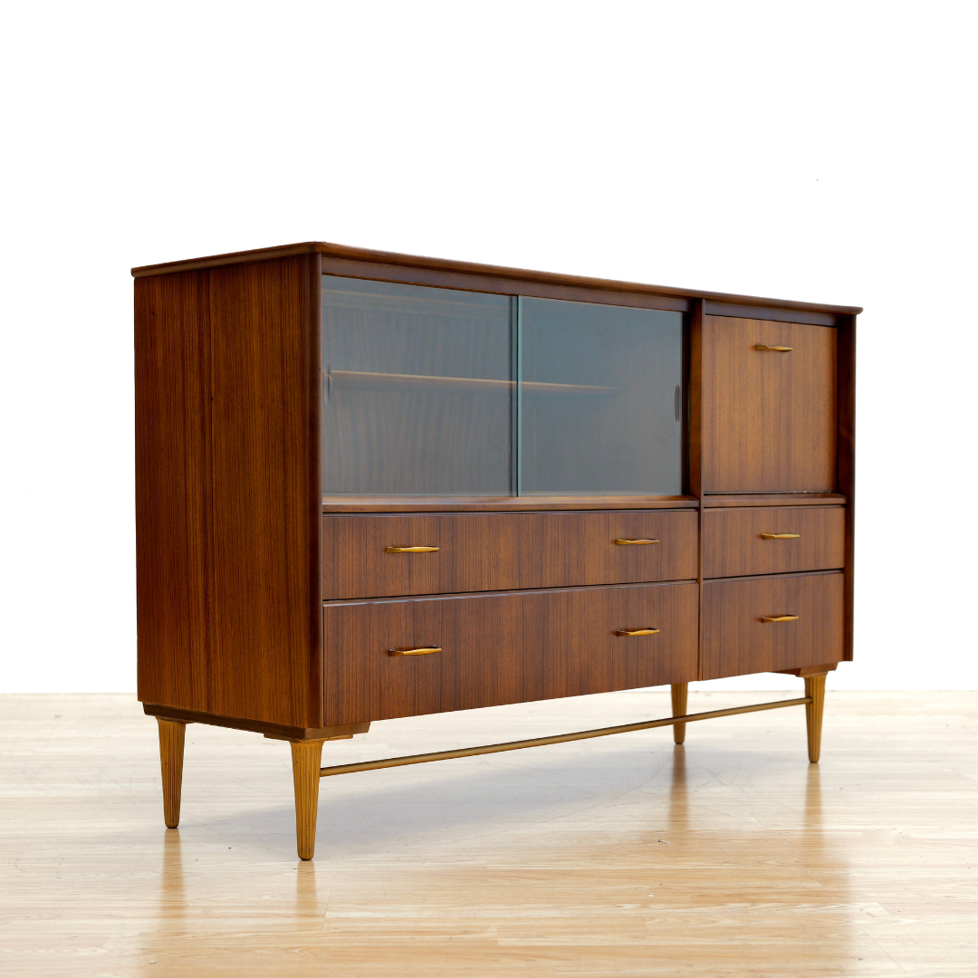 This vintage credenza/buffet was produced by Lebus Furniture during the 1960s.The cabinet is a versatile piece, with china storage, drop down drinks cabinet and four lower drawers. A modernist, well crafted cabinet with brass pulls to finish the look, it is a classy example of mid-century design.