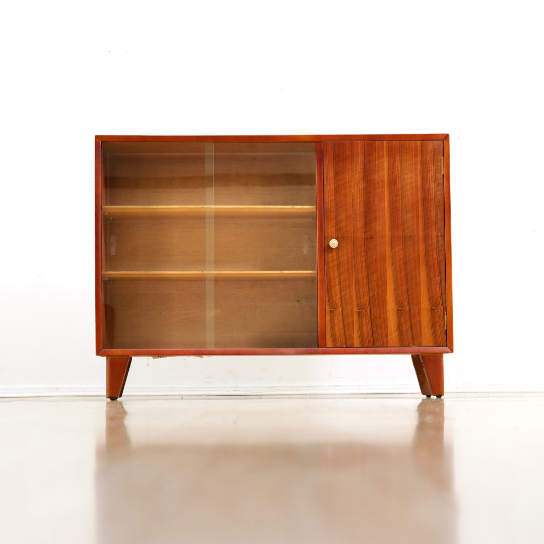 This Mid Century cabinet was produced by Lebus Furniture during the 1960s. With beautiful rosewood front grain on the right hand door and two sliding glass doors for display on the left it has a variety of uses for both storage and display.