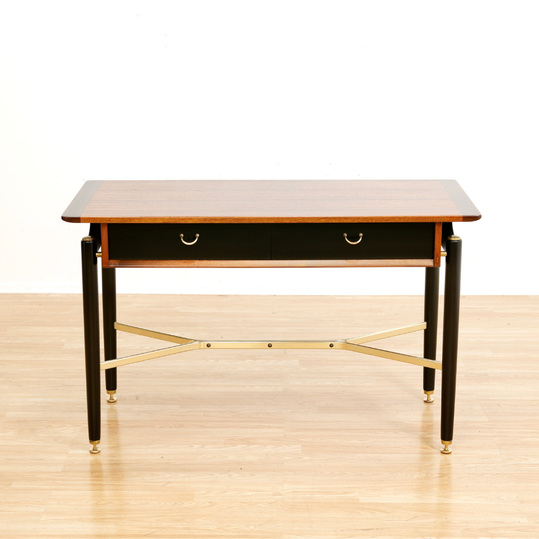 This mid-century console dresser was produced by E Gomme (G Plan) during the 1960s. A beautiful example of E Gomme's Librenza range it is made from Tola wood. The cabinet has two drawers and sits on an ebony frame with brass supports and hardware. A versatile piece, it would be perfect as an entryway console, small vanity table or desk.