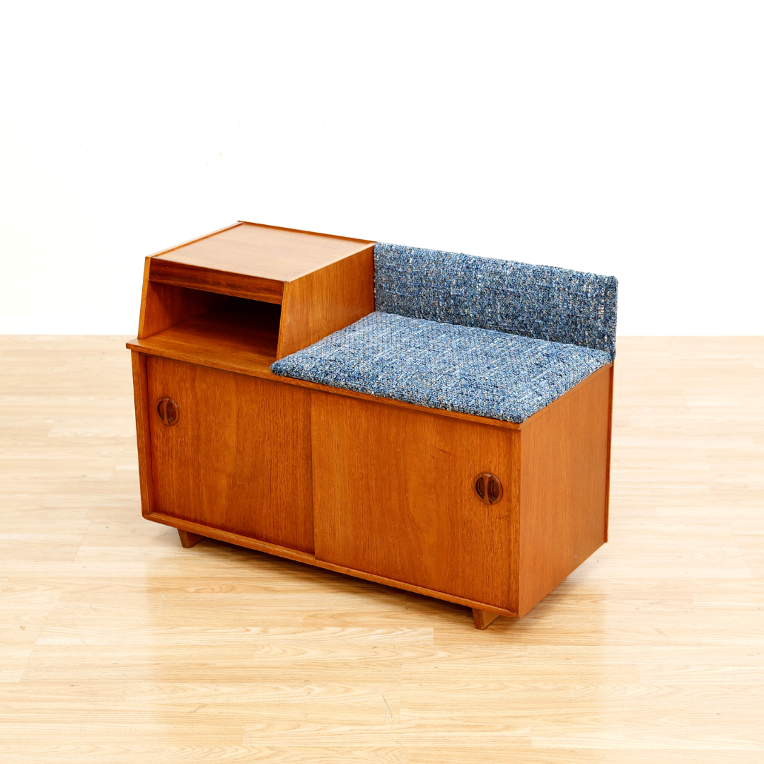 This vintage entryway bench was designed and manufactured in England by 'Chippy Heath' during the 1960s. With a wonderful Scandinavian design this mid-century bench has freshly upholstered seat pads. Perfect for an entryway or in the living room as a lamp table.