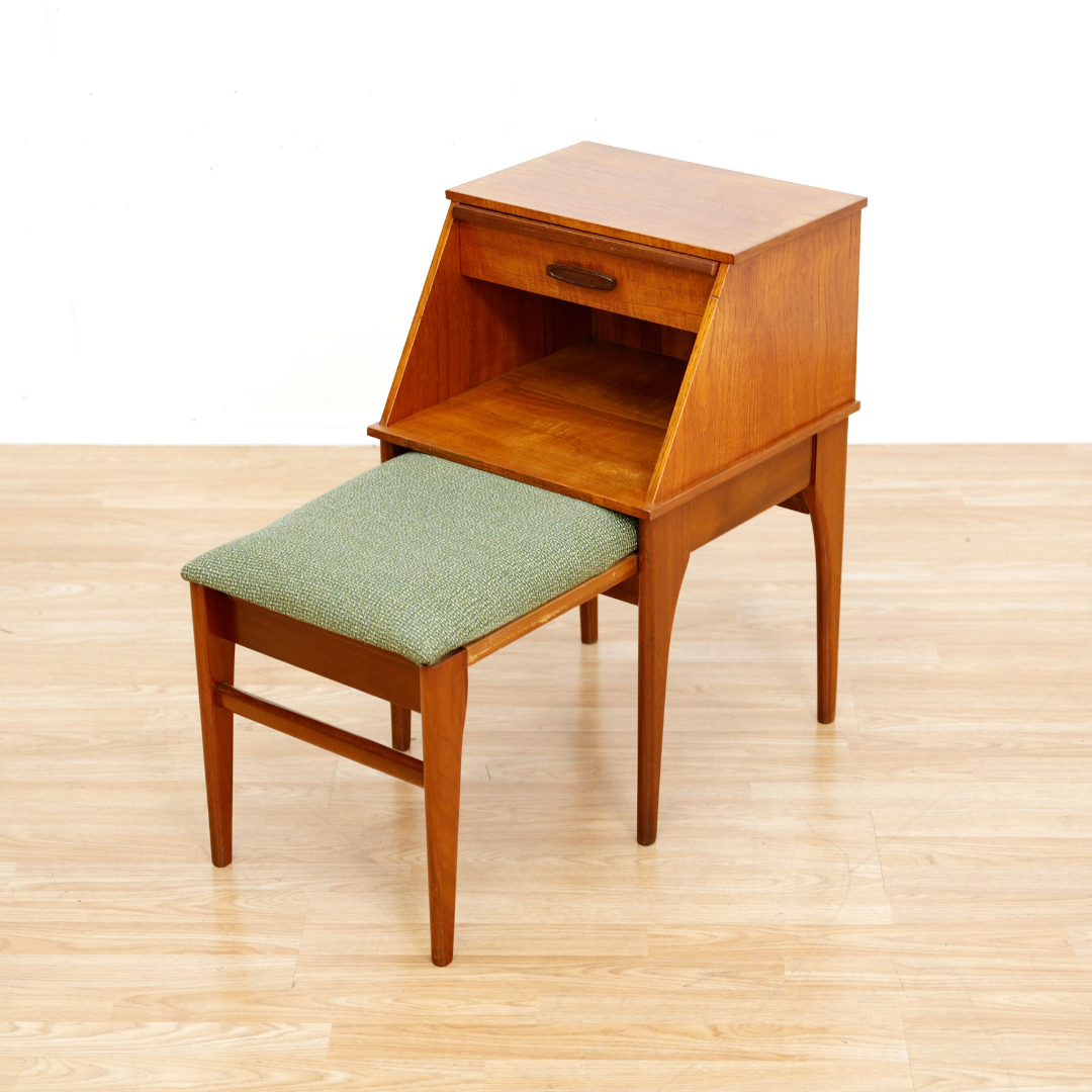 This vintage entryway side table was designed and manufactured in by 'Chippy Heath' during the 1960s. With a wonderful Scandinavian design and delicate feel this mid-century table has a neat little pull out seat upholstered in a leafy green weave fabric.