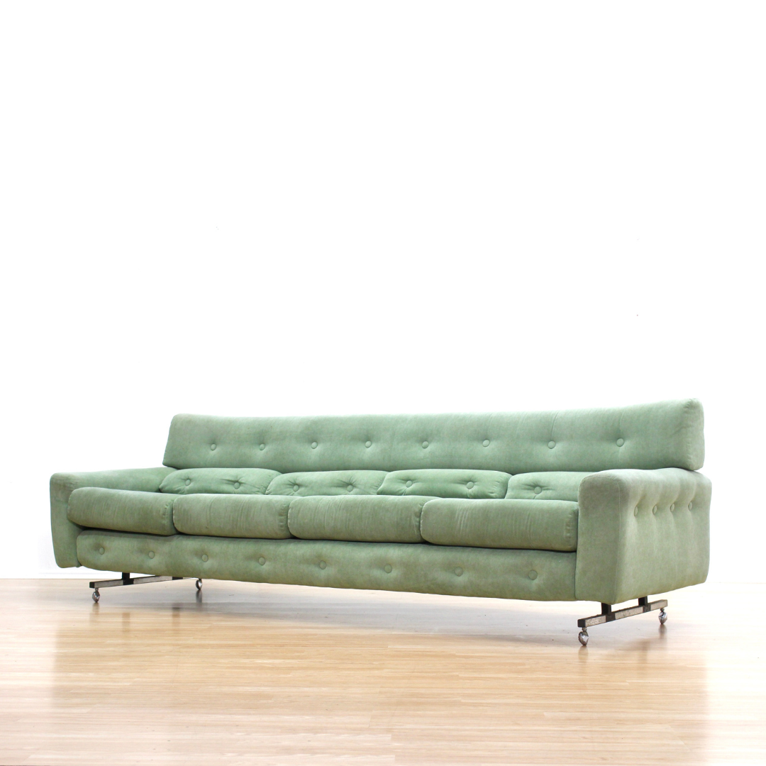 Very rare Mid Century Modern tufted sofa in mint green velvet upholstery. The sofa is a harder to find four seater and has chrome sled legs and minimalist design.