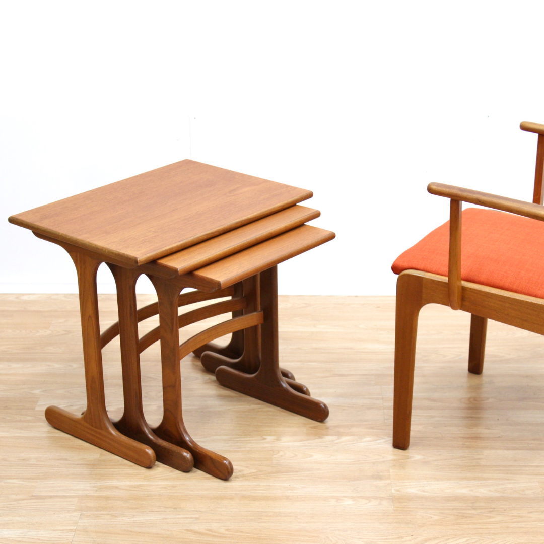 Mid-century set of nesting tables by G Plan. Constructed from teak and afromosia, these quality side tables are wonderfully designed and are perfect coffee tables for when you have company.