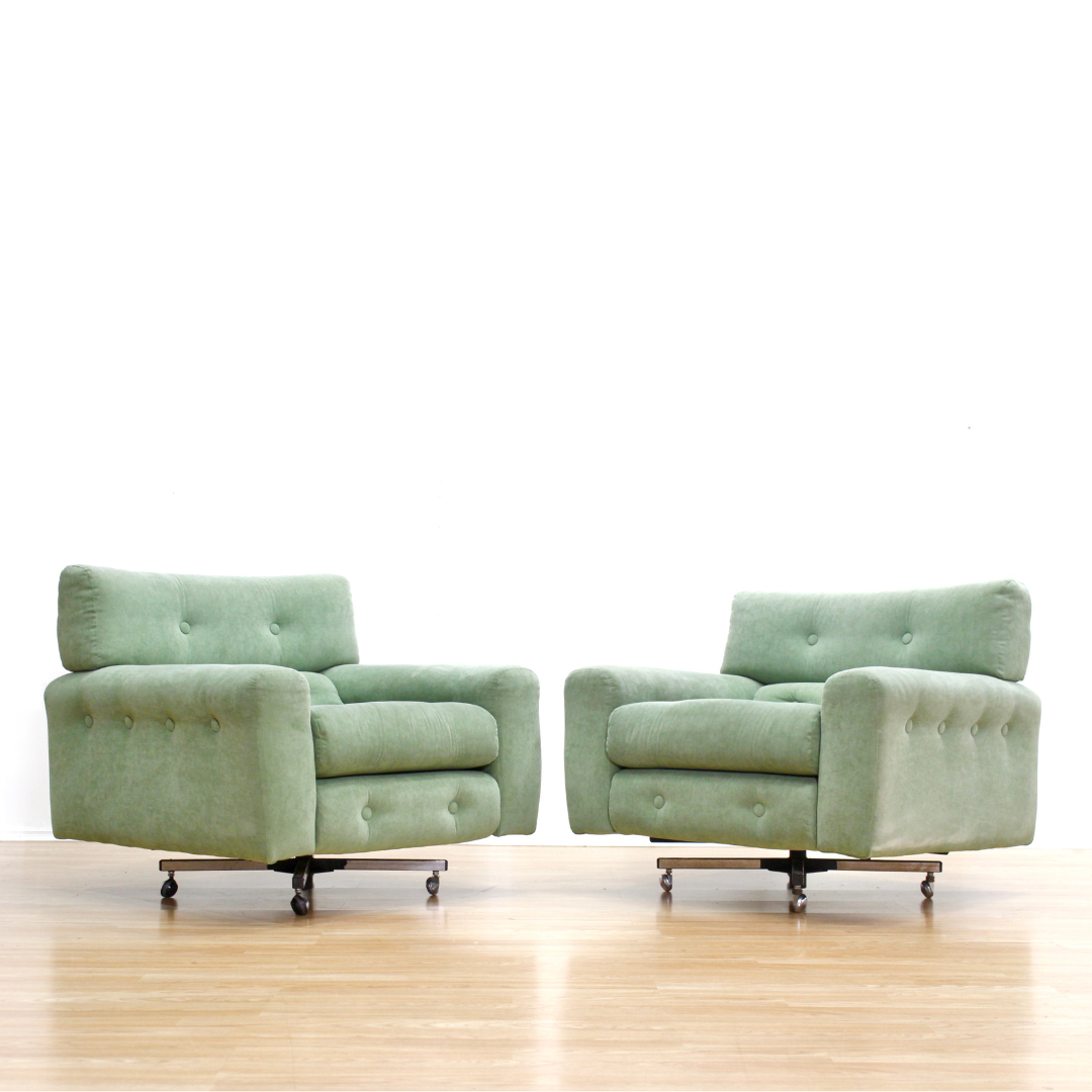 Very Rare Mid Century Modern tufted lounge chairs in minty green velvet upholstery. The chairs have cross swivel bases which are on wheels.