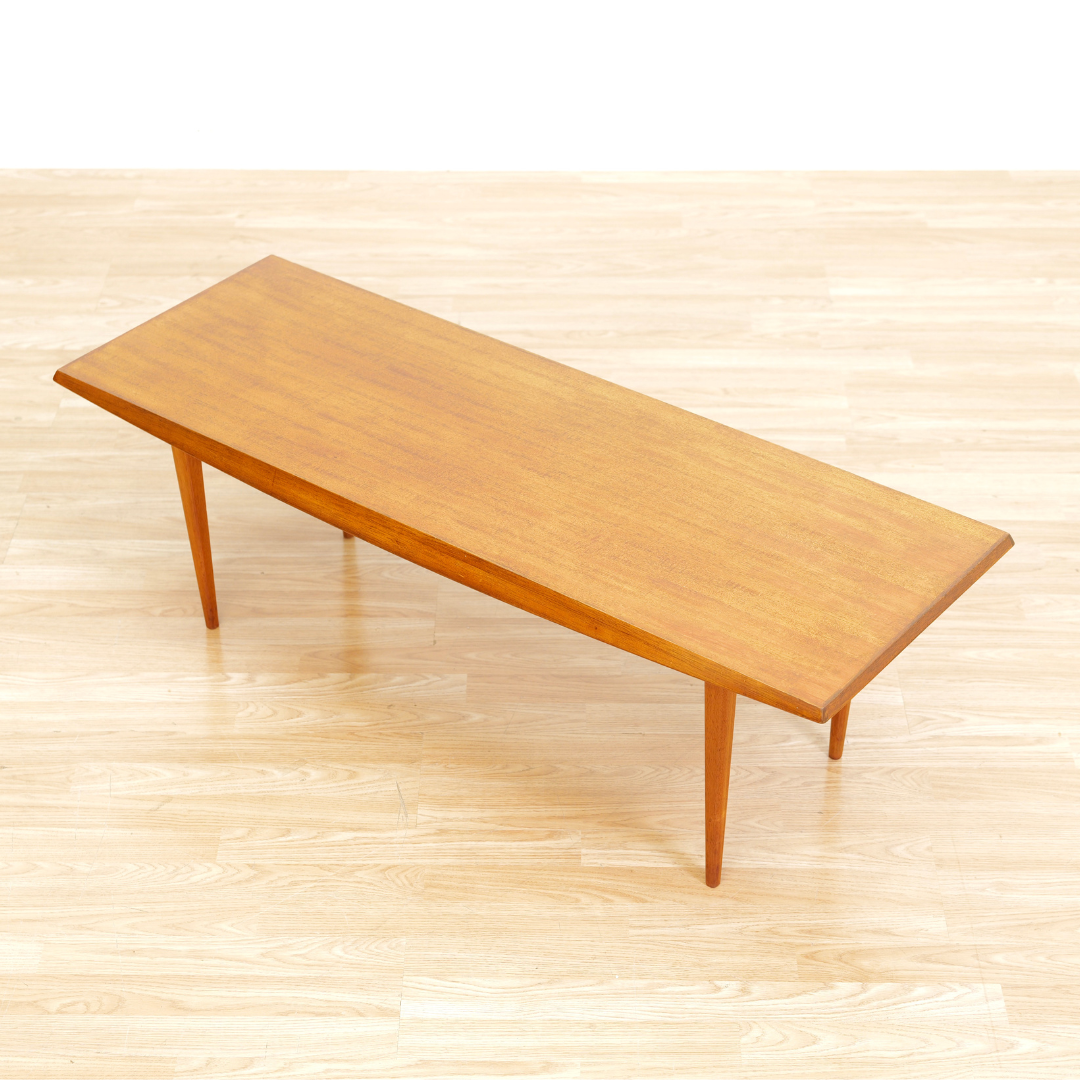 This Mid Century coffee table was designed by Trevor Chinn for Gordon Russell during the 1960s. Made from teak with a subtle chamfered edge and elegant tapered legs, this is a wonderful example of British mid-century design. The table is very elegant, with great lines and beautiful slim legs.