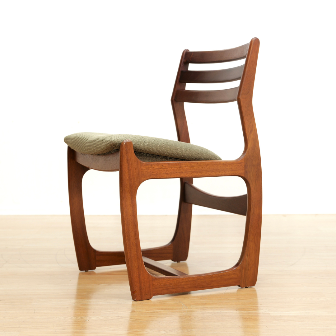 This stunning single desk chair was designed by Portwood Furniture, UK during the 1960s. Produced in teak with freshly upholstered green color seat pad and ergonomically-designed back rest. The chair is structurally solid with no loose joints or wobbles and quality design. Perfect to be used as a vanity chair or as a small desk chair.