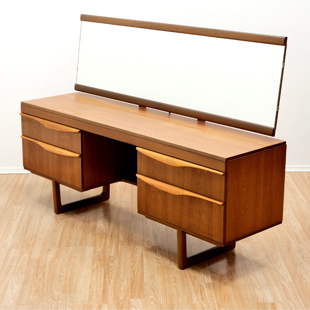 This vintage vanity has a wonderful mid-century design and beautiful tone to the wood. Produced in teak by Austinsuite Furniture, the vanity has a Scandinavian design influence consisting of four drawers with beautiful pulls and full width articulated mirror.