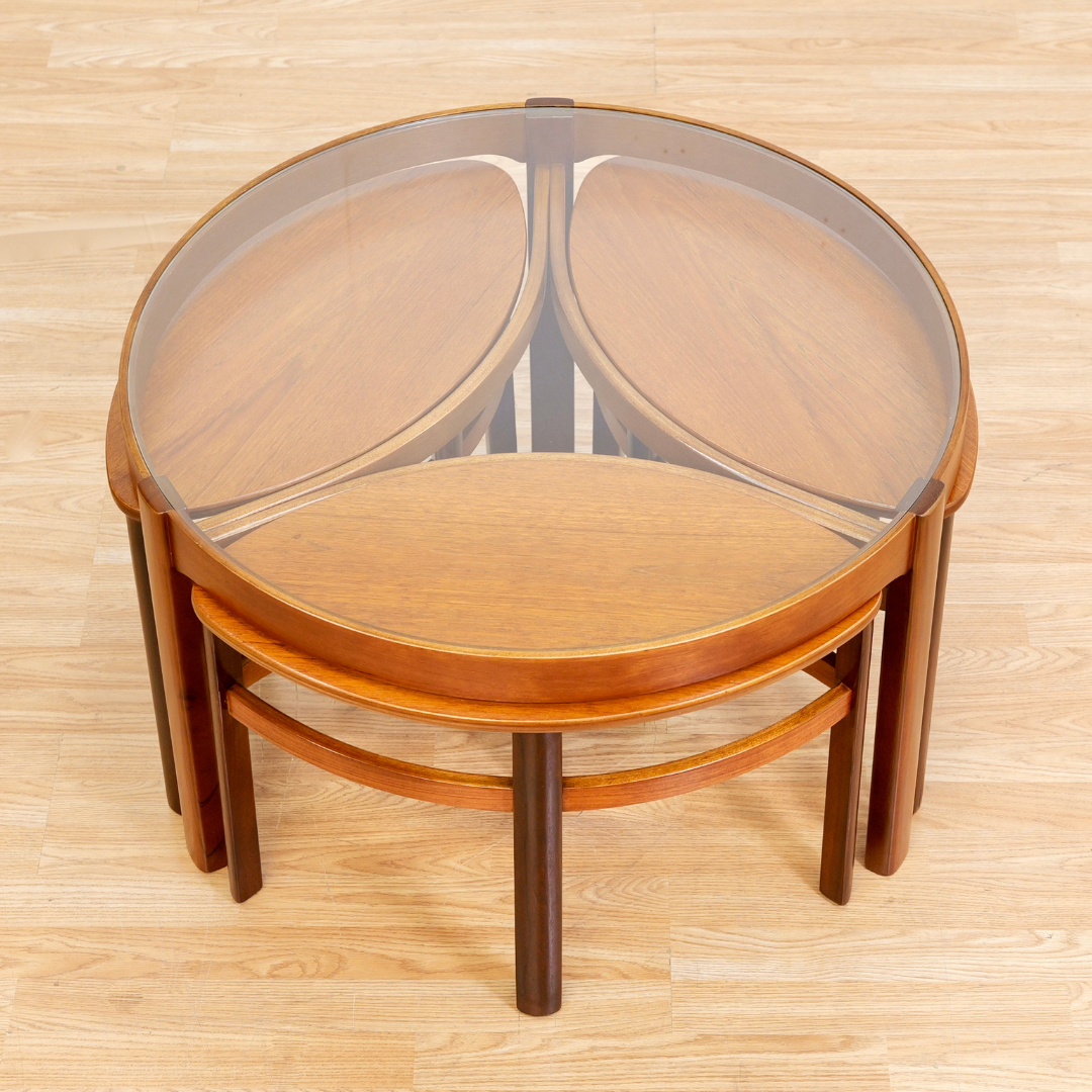 Mid-century set of 'Trinity' nesting tables by Nathan Furniture. A stunning vintage round coffee table in teak and afromosia wood, consisting of three leaf-shaped nesting tables and a clear glass tabletop.