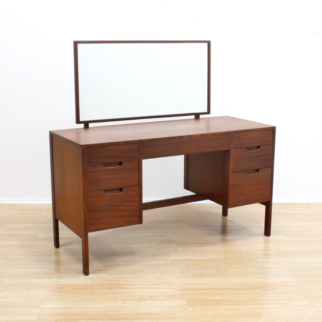 This wonderful vanity was produced during the 1960s by Robert Heritage for Archie Shine. Known for their quality constructions and sleek designs this is a stunning example of their mid-century output made from African Teak. . With articulated mirror, beautifully curved drawer pulls and cleanly designed console this is a classy piece of British craftsmanship.