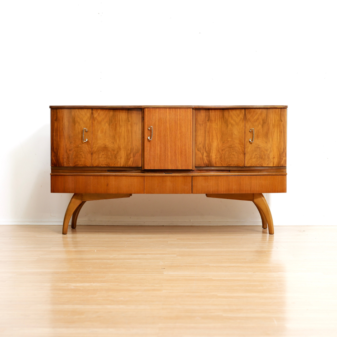 This vintage mid-century cocktail cabinet credenza was designed and manufactured by Beautility Furniture in England during the 1960s. A beautiful, gracefully designed credenza the walnut and mahogany cabinet sits on beautifully curved feet and has a fantastic grain throughout. With ample cabinet space and 3 drawers, the middle of the cabinet opens with a smooth mechanism to reveal shot glass storage and pouring shelf which also lights up!