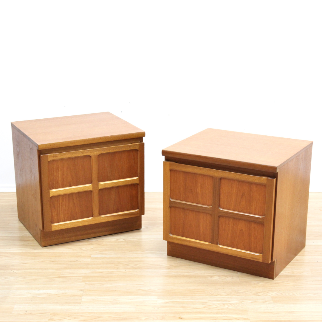This pair of mid-century nightstands were produced by Nathan Furniture during the 1970s. The cabinets are typical of the period, with Nathan's signature door paneling on the doors.