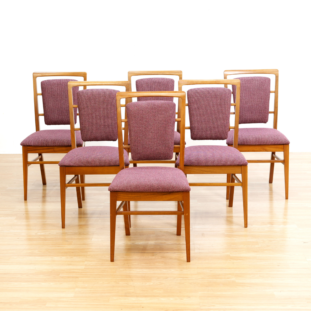 These vintage chairs were produced by Alfred Cox during the 1950s. A very unique design with 'floating' backrests, the fresh grape color upholstery compliments the fames beautifully. They are a quality set by one of the leading British furniture makers of the mid-century period.