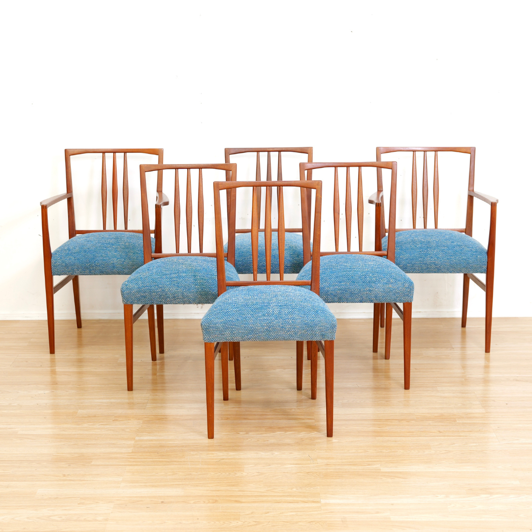 This stunning set of six dining chairs were designed and produced by Gordon Russell during the 1960s. These mid-century chairs are freshly reupholstered in a vivid blue weave fabric and have beautifully made frames typical of Gordon Russell's quality. Each chair is structurally solid with no loose joints or wobbles.
