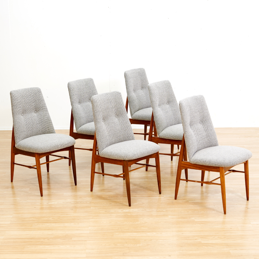 This set of six vintage dining chairs were designed by Peter Hayward for Vanson Furniture during the 1950's. The freshly upholstered seats have high, tufted backrests that sit atop elegantly splayed frames with spindle carved support accents.