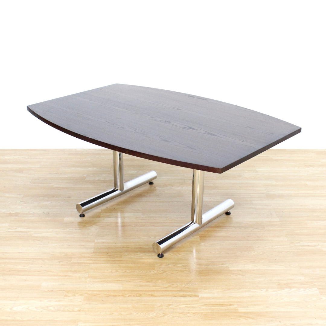 This stunning table was designed by Tim Bates for Pieff Furniture in 1976. A classic piece of British design it was known as the 'TT' table due to the striking shape of the chrome frame. With a minimalist design and beautiful shaped table top it can be used as a desk or dining table.