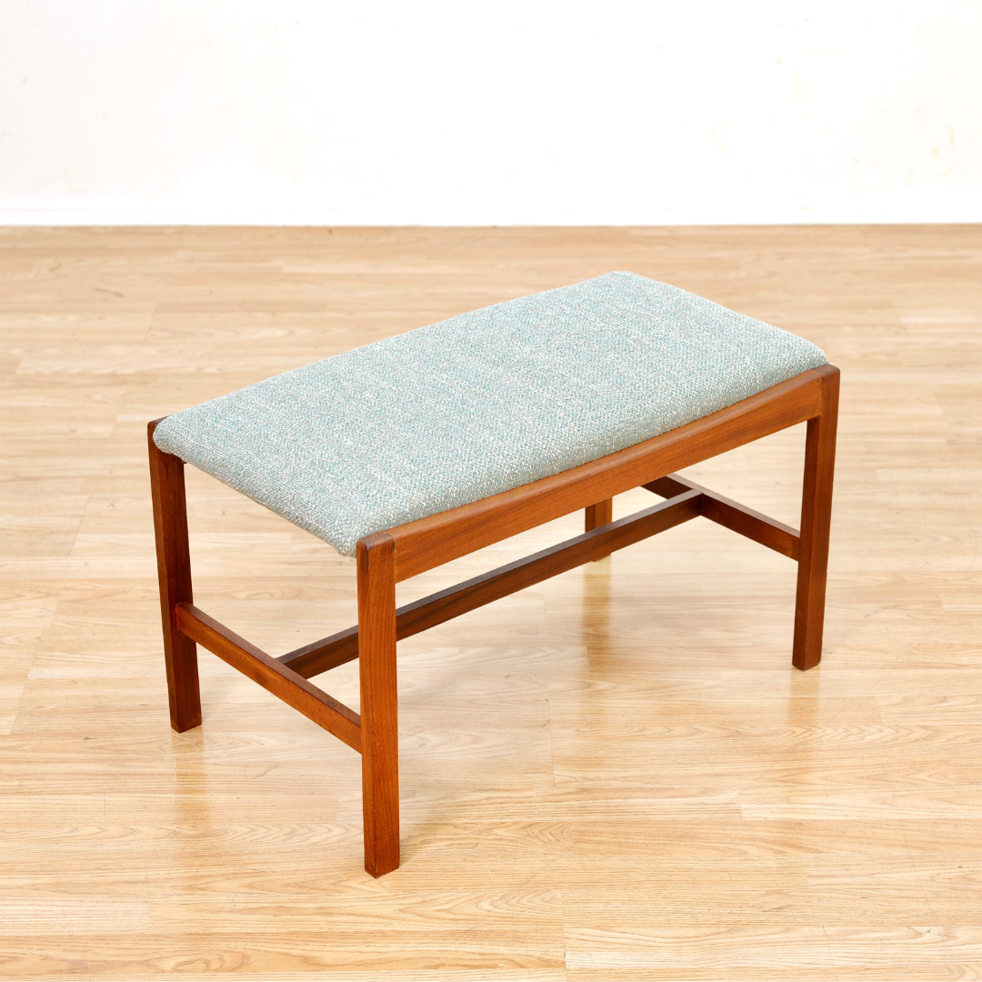 This mid-century stool was produced in England during the 1960s. Made from teak it is a wider example with new light teal weave fabric.